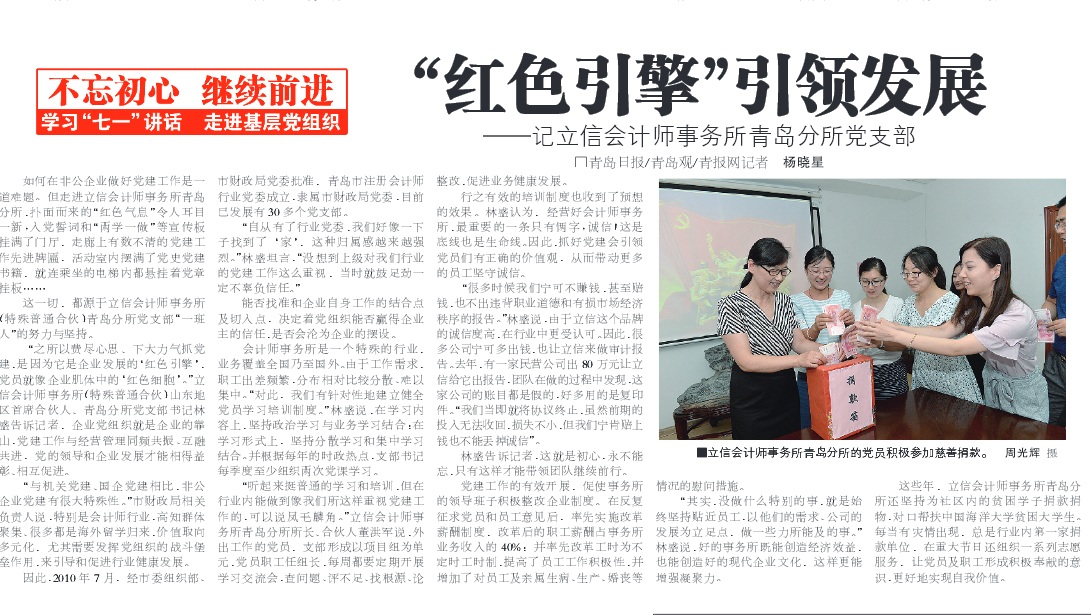 是唯一一家获此殊荣的社会组织。为此,《青岛日报》于7月28日对立信青岛分所党支部书记林盛进行了专题采访。