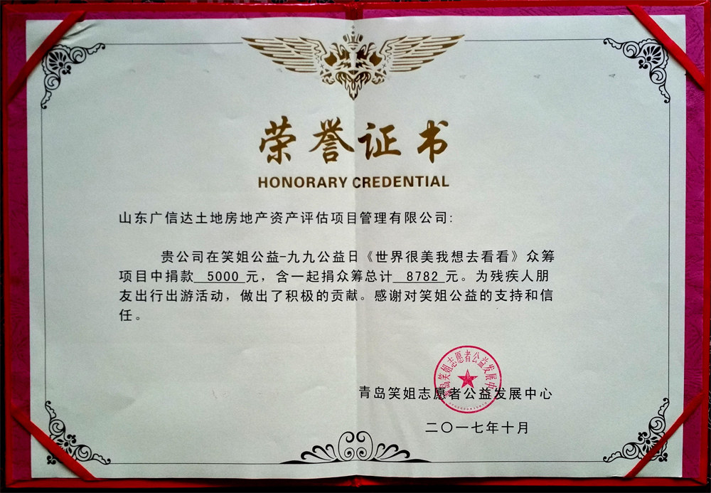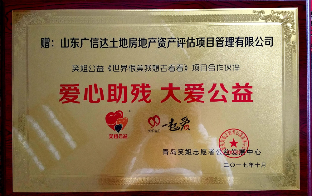 山东广信达土地房地产资产评估项目管理有限公司为本次助残公益众筹项目在资金、人力等方面提供鼎力支持。这不是该公司第一次出捐为社会做公益活动,在国家、社会及地方历次重大事件中,该公司一直在为公益事业出力,在当地留下了较好的影响。“报效国家、贡献社会”一直是公司文化中不可动摇的核心理念。正是在这个理念之下,支持公益活动,被公司视作是义不容辞的责任。