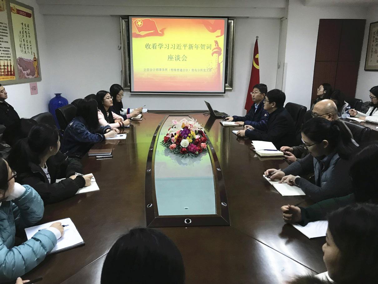 2018年1月2日上午,立信会计师事务所(特殊普通合伙)青岛分所(以下简称“立信青岛分所”)党支部在立信青岛分所三楼会议室组织在所的党员及群众收看并学习了习近平主席2018年新年贺词。