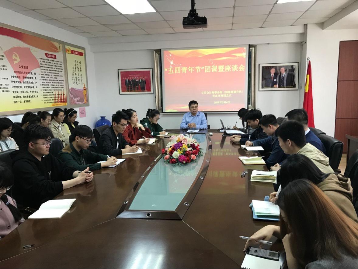 为纪念五四运动99周年,进一步激发我单位团组织及青年的生机和活力,加强青年力量的凝聚和团结,2018年5月4日,立信会计师事务所(特殊普通合伙)青岛分所(以下简称立信青岛分所)团总支组织单位青年团员举行了“五四青年节”团课暨座谈会,立信青岛分所团总支书记孙丽同志主持了本次座谈会,党支部书记林盛同志以《弘扬“五四”精神,立足本职岗位,努力做新时代优秀共青团员》为题,讲了一堂生动的团课。