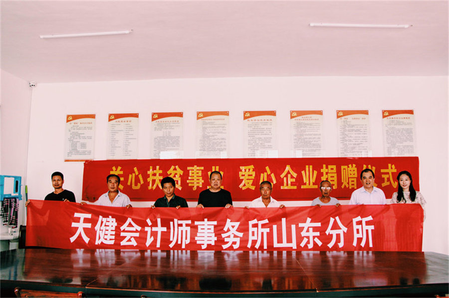 2018年8月9日,天健会计师事务所山东分所总经理刘加宝、工会主席韩炳海、人力资源部经理宋小燕前往商河县洼李村,为提升洼李村的环境捐助善款四万元。济南市金融办副调研员李书旗、副处长朱洪权、怀仁镇镇长王修权、洼李村部分老党员参加了此次捐赠仪式。
