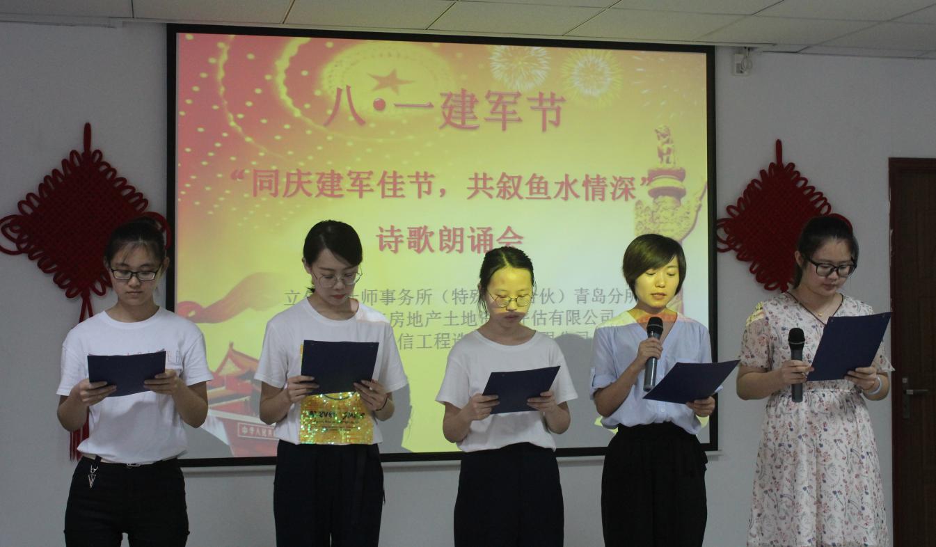 八一到来之际,为隆重纪念中国人民解放军建军91周年,进一步增强双拥意识,丰富双拥工作的形式和内容,激发基层党组织活力。立信会计师事务所(特殊普通合伙)青岛分所组织全体员工举办以“同庆建军佳节,共叙鱼水情深”为主题的诗歌朗诵会。