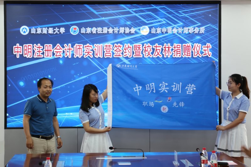 为进一步促进产学研结合,提升在校生理论联系实际能力,吸引更多的有志之士加盟注册会计师事业,为全省注册会计师行业储备人才,5月24日下午,由山东财经大学、山东省注册会计师协会和山东中明会计师事务所联合发起的山东财经大学注册会计师方向 “中明实训营”签约仪式在山东财经大学燕山校区办公楼七楼报告厅顺利举行,出席仪式的有:山东财经大学副校长张新、会计学院有关负责人及学校有关处室负责人,山东省注册会计师协会会长兼秘书长韩群、副会长兼常务副秘书长梁仕念,山东省注册会计师协会常务理事、山东中明会计师事务所董事长巴树青,山东中明会计师事务所副总经理谷毓及有关部门负责人等。仪式由山东财经大学会计学院党委书记张涛主持,首批入选的30名在校生学员出席了活动。