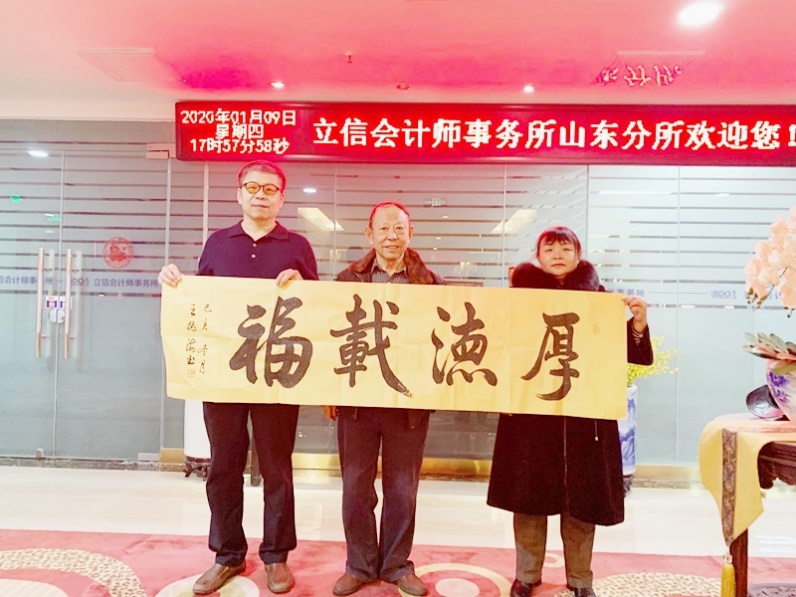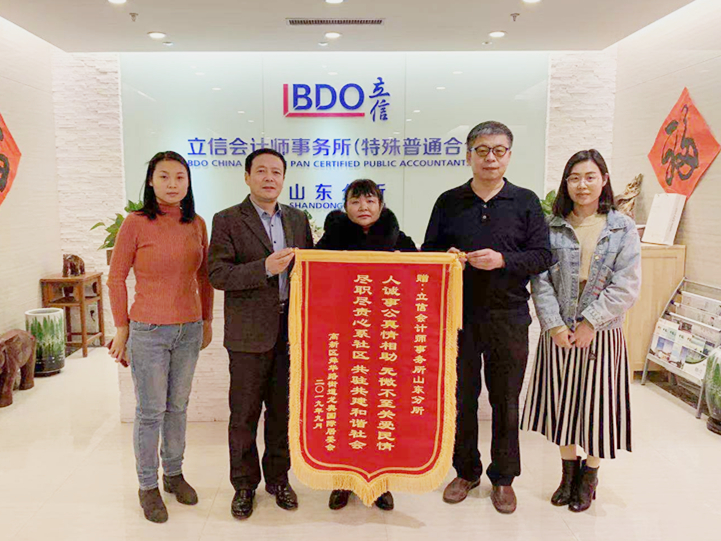 1月9日,立信会计师事务所(特殊普通合伙)山东分所出现暖心一幕,济南高新区舜华路街道龙奥国际社区居委会将一面写着“人诚事公真情相助,无微不至关爱民情;尽职尽责心系社区,共驻共建和谐社会”的锦旗和饱含真情祝福的春联送到立信山东分所,感谢立信山东分所长期以来对社区工作的大力支持和社区群众的深切关爱。