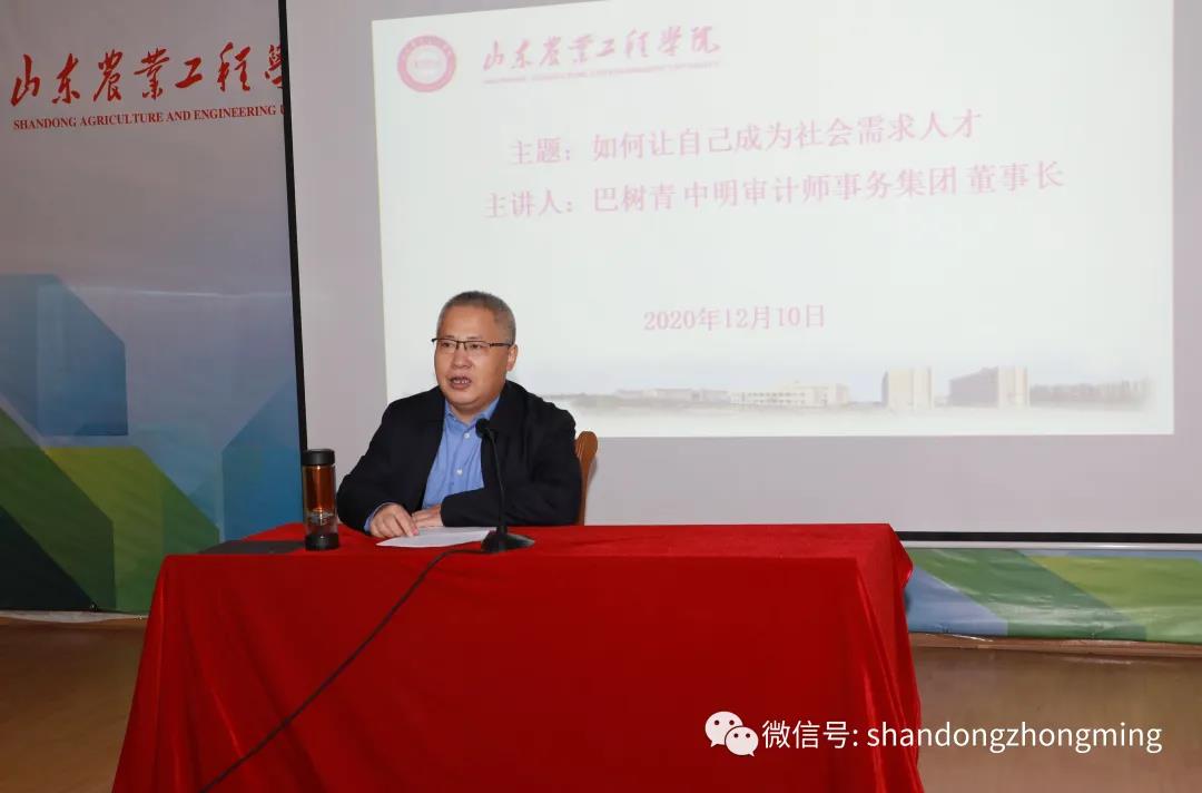 2020年12月10日,山东中明会计师事务所有限公司董事长巴树青受山东农业工程学院商学院邀请给在校生做《如何让自己成为社会需求人才》专题报告。山东农业工程学院商学院院长王苹香主持了报告会。事务所集团党支部书记、副总经理李艳出席了报告会。
