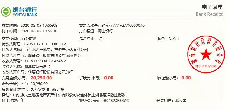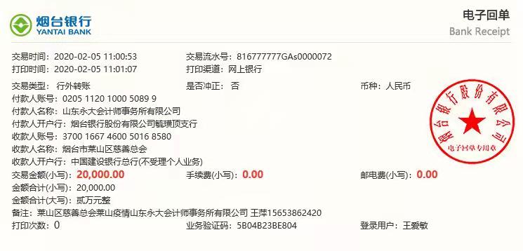 做为企业虽不能直接参与一线的战斗,但是山东永大会计师事务所有限公司及山东永大土地房地产资产评估有限公司积极响应号召组织全体员工进行了爱心助捐活动,以我们力所能及的方式为这场战役的胜利,贡献出自己的力量。山东永大会计师事务有限公司向烟台市莱山区慈善总会捐款2万元用于企业当地疫情防控工作。山东永大土地房地产资产评估有限公司及全体职工向湖北省慈善总会捐款2.025万元用于湖北疫情防控。