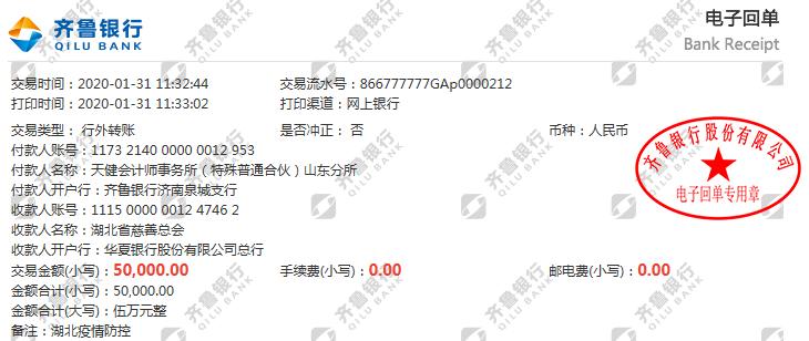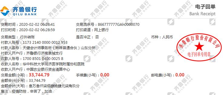 天健山东分所党支部积极响应以习总书记为核心的党中央的号召,始终秉承“专业报国、服务社会”的宗旨,自觉履行社会责任,积极投身防疫阻击战,充分发挥党组织战斗堡垒和党员先锋模范作用。1月31日,天健山东分所向湖北省慈善总会捐款5万元。随着疫情的不断发展,华中科技大学同济医学院附属协和医院(即武汉协和医院)作为抗击疫情最前线的医院,医护人员不分昼夜的坚守岗位。分所的广大员工备受感动,积极为武汉协和医院捐款,累积达33744.79元。