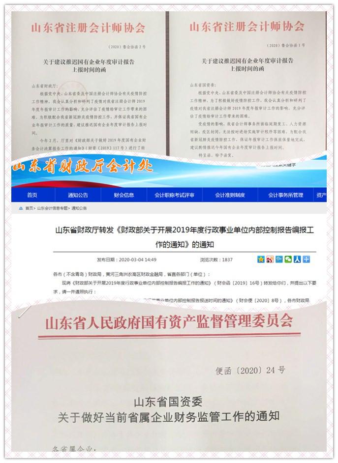 根据党中央、国务院和山东省委、省政府以及中国注册会计师协会有关疫情防控工作精神,协会及时认真分析研判了疫情对我省注册会计师行业工作的影响,充分评估了疫情给审计工作带来的困难,为配合做好我省新冠肺炎疫情防控工作,保证年报审计等工作的质量,协会于2月25日分别致函省财政厅、省国资委,建议延迟会计师事务所年度审计报告的报送时间。