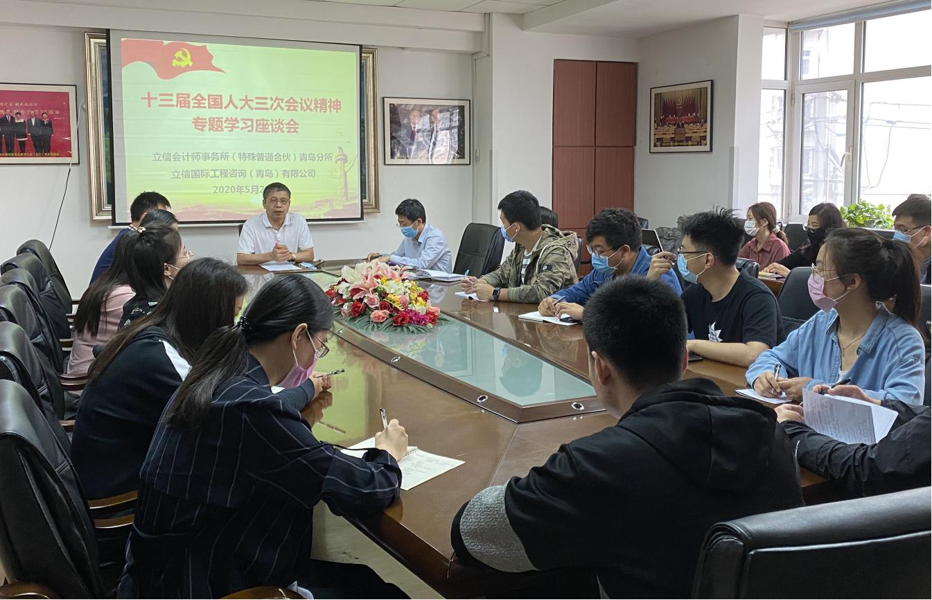 5月29日,立信会计师事务所(特殊普通合伙)青岛分所党支部组织召开“两会”精神专题学习座谈会,认真学习习近平总书记在参加各代表团审议时的讲话精神,传达学习李克强总理《政府工作报告》精神。立信会计师事务所(特殊普通合伙)青岛分所党支部书记林盛主持会议并进行了领学,在所全体党员及骨干员工参加了专题学习会。