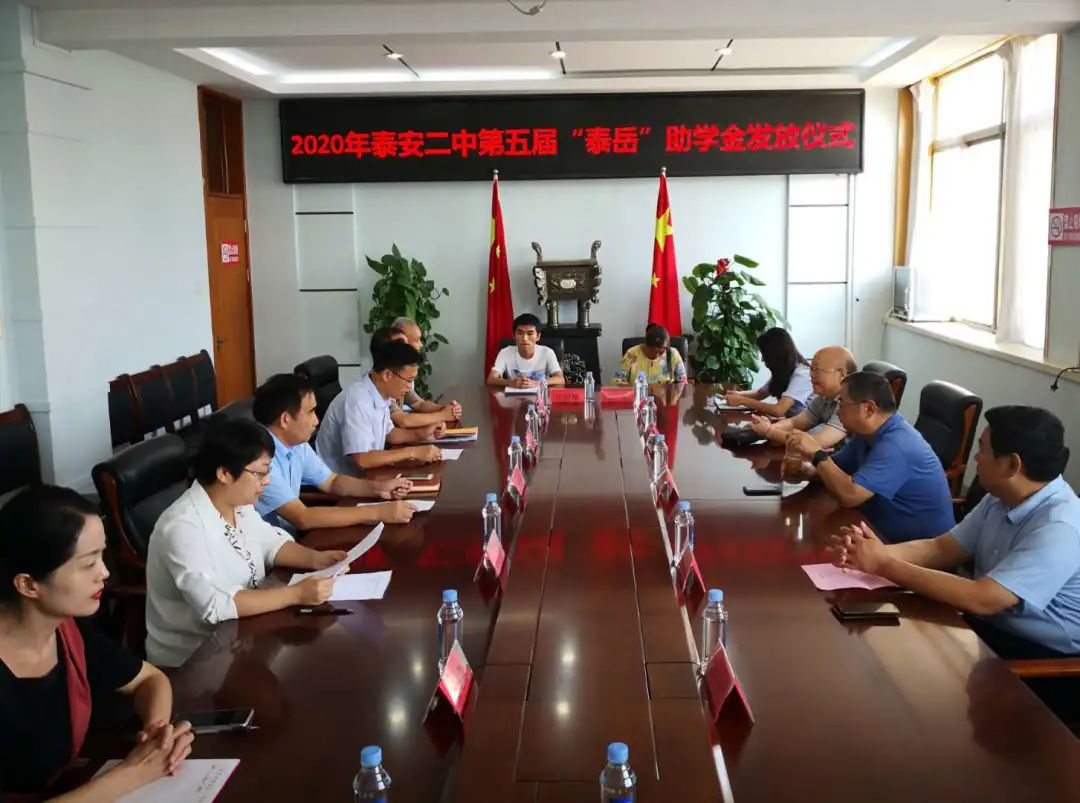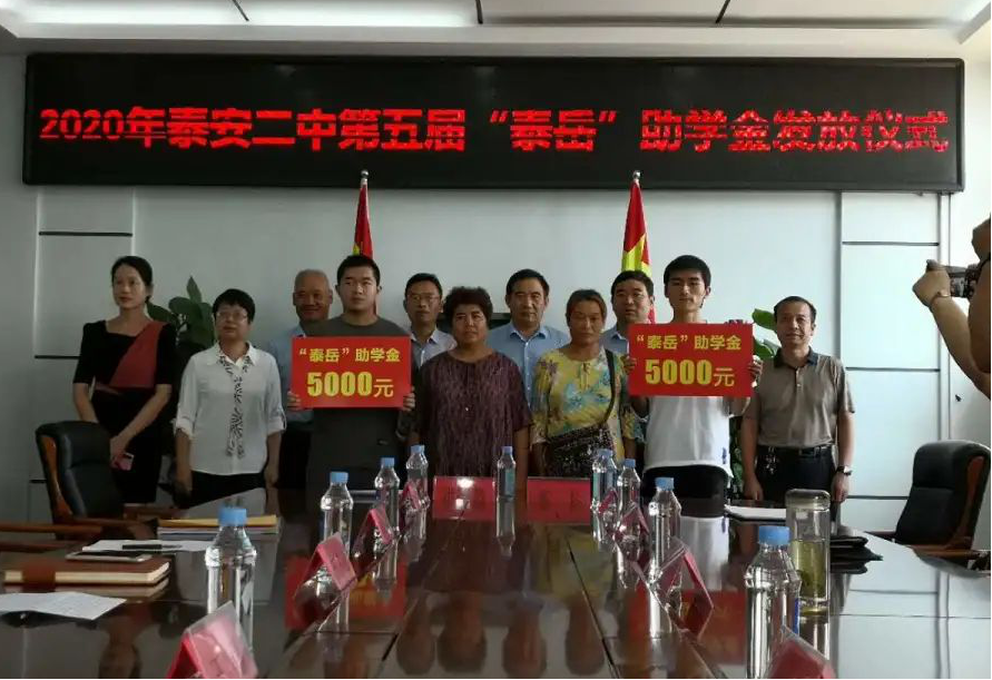 2020年9月4日,泰安二中第五届“泰岳”助学金发放仪式在泰安市第二中学隆重举行。出席本次仪式的有市行业党委委员万惠孜、泰山区人大常委会委员沈志强、武传彬、泰安泰岳联合会计师事务所所长李国以及泰安市第二中学副校长亓子成等。