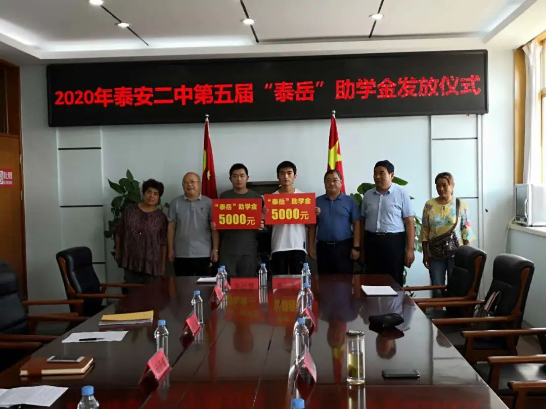 “泰岳”助学金是2016年设立,由泰安泰岳联合会计师事务所出资,旨在帮助家庭困难、品学兼优的高三毕业生圆梦大学。目前已经连续举办五届,共资助泰安二中优秀毕业生10名。本届“泰岳”助学金资助两名优秀毕业生,分别是泰安二中的陈国祥和张阿赞同学同学,其中陈国祥同学以623分考取兰州大学物理专业,张阿赞同学以599分考取浙江理工大学数学类专业。