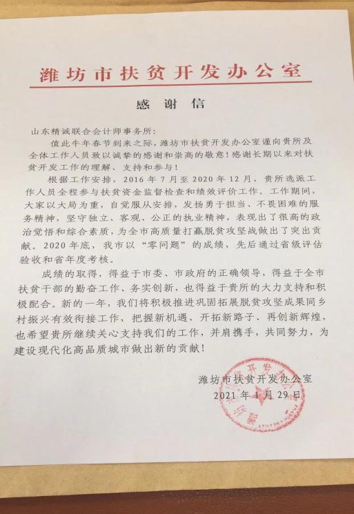 2021年1月29日,潍坊市扶贫开发办公室致信高度评价山东精诚联合会计师事务所在2016年7月至2020年12月期间潍坊市扶贫资金的监督检查与绩效评价工作。