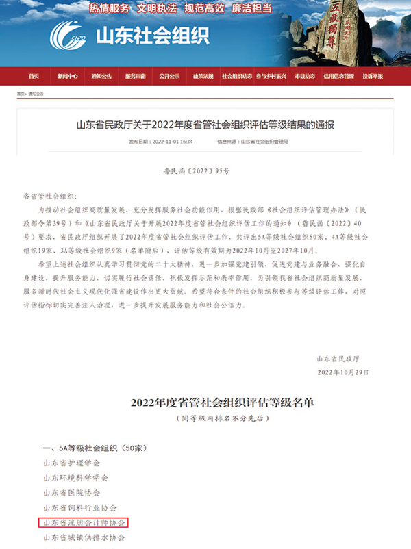 10月29日,山东省民政厅发布《2022年度省管社会组织评估等级结果通报》,经评估专家组对协会党建工作、基础条件、内部治理、工作绩效、诚信建设和社会评价等多个方面的综合评审,山东省注册会计师协会被评为5A等级社会组织,社会组织等级是由民政部出台的《社会组织评估管理办法》中关于社会组织的等级评定标准,社会组织评估共设五个等级,其中5A等级是评估工作的最高等级。这一荣誉的取得,标志着省注协规范化建设与创新性发展迈向新时代新台阶。