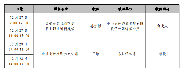 根据山东省注册会计师协会《2022年度山东省注册会计师培训计划》,方便会员完成年度继续教育培训学时要求,现于12月27日-28日举办会计师事务所职业道德等内容直播课程,作为面授培训学习计入培训学时。具体事项通知如下: