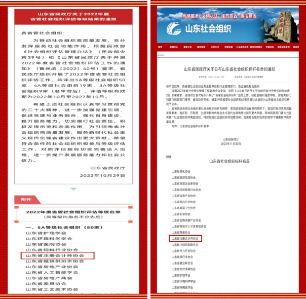 12月2日,山东省民政厅发布山东省社会组织标杆名单,山东省注册会计师协会荣耀上榜,喜获“山东省社会组织标杆”荣誉称号。这是继10月29日刚刚被评为“5A等级社会组织”后再获殊荣,可谓双喜临门,也是前所未有的至高荣誉,将进一步激励协会引领全行业深入学习贯彻党的二十大精神,以更高标准开展好各项工作,助力行业高质量服务我省经济社会发展走在前。