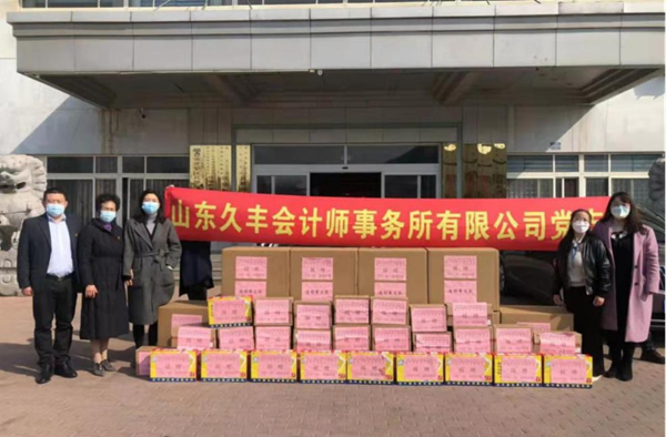 山东久丰会计师事务所有限公司党支部积极发挥党建引领作用,组织员工开展抗疫捐款,用于购买防疫物资及相关保障物资,为抗疫献力。公司党支部书记刘兰青带领部分党员干部至烟台市芝罘区只楚街道办事处,为一线抗疫人员送去采购的军大衣等防疫物资。公司董事长柳鹏飞带领员工为福山福新街道办事处、福山门楼镇肖家村、蓬莱区大柳行镇石家村、牟平区高陵镇曲家疃村捐赠防护服、N95口罩、防护面屏等防疫物资,以及为贫困户和空巢老人准备的米、面、油、调味品等生活物资。山东久丰会计师事务所已通过各种渠道捐献防疫物资累计近十万余元,事务所及党支部通过系列公益捐助活动引导教育每名党员、干部、职工对国家、对党身怀感恩之情,为党和人民尽绵薄之力。