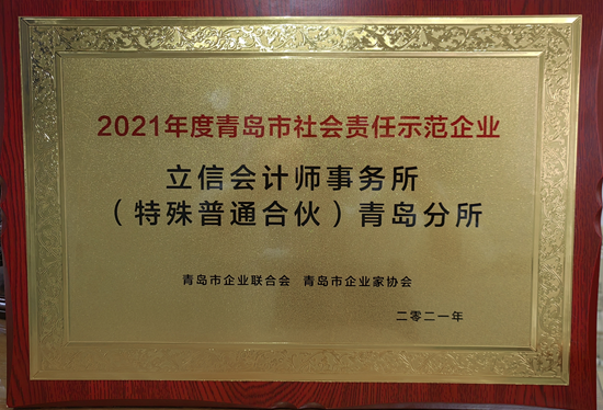 “青岛市社会责任示范企业”创建活动始于2013年,由青岛市企业联合会、青岛市企业家协会组织评选,旨在不断倡导企业积极承担和履行社会责任,发挥先进示范作用,进一步促进青岛市经济的可持续发展,实现经济、生态及社会效益的和谐统一。立信青岛分所是创建活动以来,青岛市首家获得此奖项的会计师事务所。