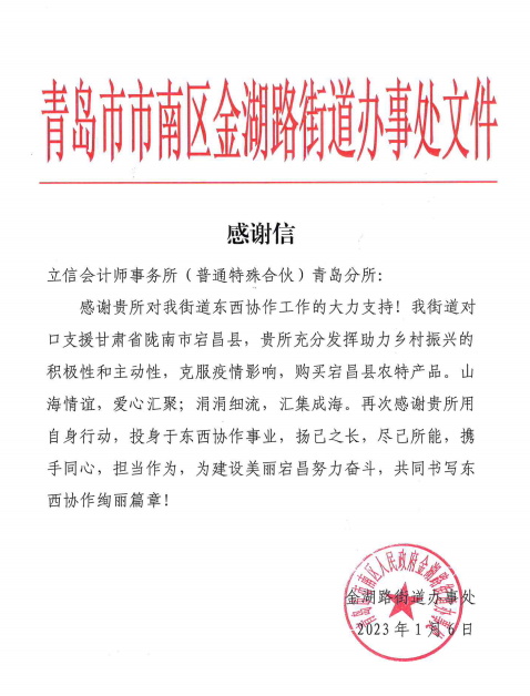 对此,驻地街道专门向青岛分所致感谢信,信中称“山海情谊,爱心汇聚;涓涓细流,汇集成海,再次感谢贵所用自身行动,投身于东西协作事业,扬己所长,尽己所能,携手同心,担当作为,为建设美丽宕昌努力奋斗,共同书写东西协作绚丽篇章!”