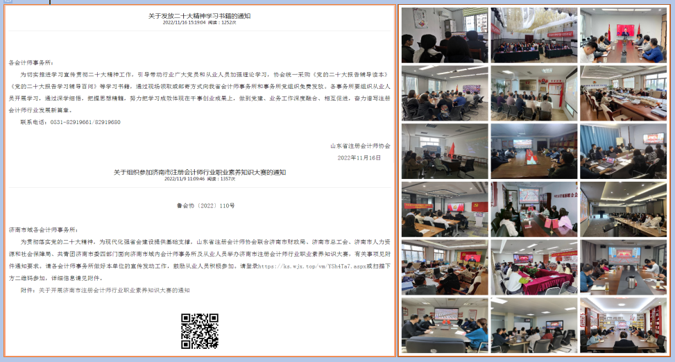 积极配合省行业党委部署要求,组织带领全省广大党员、从业人员按时收看党的二十大盛况。统一采购并免费向会计师事务所和事务所党组织发放《党的二十大报告学习辅导读本》《党的二十大报告学习辅导百问》等学习书籍。联合济南市财政局、济南市总工会、济南市人力资源和社会保障局、共青团济南市委等四部门,面向济南市域会计师事务所及从业人员举办职业素养知识大赛。