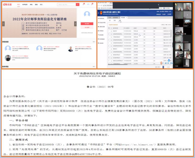 积极贯彻落实国办发30号文件精神,联合省财政厅会计处开展行业统一监管平台操作培训班,大力宣传并引导执业机构自觉用好监管平台;在省级协会层面率先推进企业往来电子函证,免费向全省会计师事务所提供5000份(次)电子函证,有力促进往来平台建设的宣传与应用;携手深圳注协共同搭建“CPA生涯”APP直播平台,实现优质教育资源共享、方便会员高效完成年度继续教育培训学时要求;深度推进电子非执业会员证书上线使用,年检和换发比率达100%,位列全国前列,提升了行业注册管理工作数字化水平;引导事务所通过“线上+线下”方式参加“注册会计师行业百日招聘专项活动”,助力走出人才短缺困境;加强事务所档案数字化管理,协调会员单位与第三方达成审计档案托管,行业信息化建设走在全国行业前列。