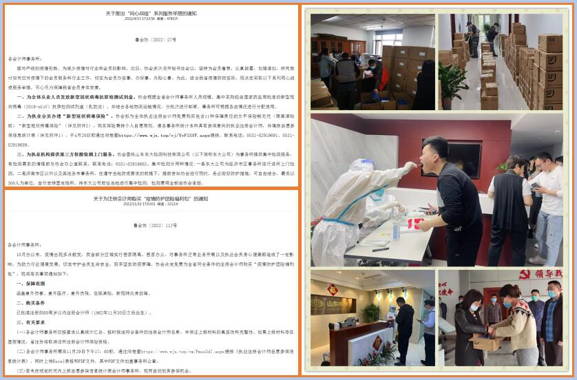 面对多点散发的疫情,协会始终把会员的健康安全放在首位,统筹谋划、精心部署,面向全省事务所和注册会计师推出派发试剂盒、办理“新型冠状病毒保险”、购买“疫情防护团险福利包”、提供第三方核酸检测上门等系列“同心战疫”免费服务举措,筑牢我省会员身体安康“防疫墙”,赢得了全体会员的积极拥护和一致点赞,受到行业内外的高度关注和认可。据统计,先后为600多家事务所4200名注册会计师办结保险,向全省事务所配发检测试剂盒近4万支,为会员提供自检便利。同时,继续减轻会员负担,为全省事务所减免2022年会费,减免金额近300万元。