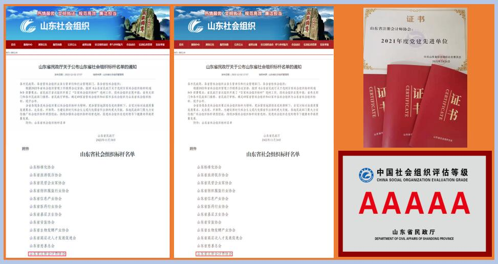 协会始终积极参与上级部门组织的各类活动,以规范化管理、标准化建设、专业性服务赢得了各级领导的充分认可和大力支持,获得了前所未有的至高荣誉,自身建设也迈上了更高台阶。在省社会组织总会组织的关于党建工作先进单位以及征集、表彰2019年以来省级社会组织服务案例等系列活动中,被评为2021年度党建先进单位,荣获“学党史,办实事”和特色主题党日活动案例、创新服务案例和优秀会刊一等奖等四项奖项,其中《提供“六大便利” 推进非执业会员年检》获创新服务案例奖项,《山东注册会计师》获省级社会组织优秀会刊一等奖;按照省民政厅开展社会组织等级评估工作的通知,协会开展了“全方位、多角度、深层次、精细化”大梳理,经过评估专家组对协会党建工作、基础条件、内部治理、工作绩效、诚信建设和社会评价等多个方面的现场综合评审,最终被评为5A等级社会组织称号;在省民政厅首次开展的社会组织标杆评选活动中,经严格审查,协会符合新时期“党建强、发展强、自律强、服务强”的治会标准,被评为“山东省社会组织标杆”称号。同时,年末喜获中国会计报2022年度“数豆中国”之“年度财会新闻推进奖”,全国财会行业范围内仅有8家单位获此殊荣。