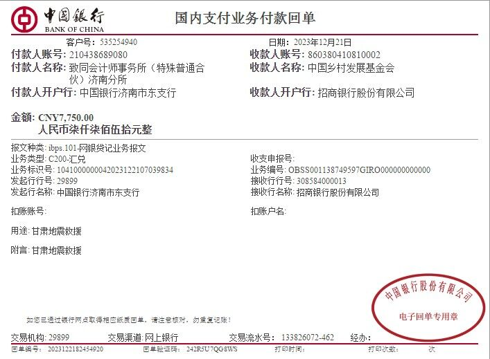 致同会计师事务所(特殊普通合伙)济南分所为了给寒冬中的受灾同胞送去问候和温情,迅速组织员工自愿捐款,大家从不同城市的审计现场纷纷积极响应,为受灾同胞贡献自己的一份微博力量,为抗震救灾助力。捐赠不分多少,善举不分前后,再小的力量也是一种帮助和支持,这是致同会计师事务所(特殊普通合伙)济南分所的担当。
