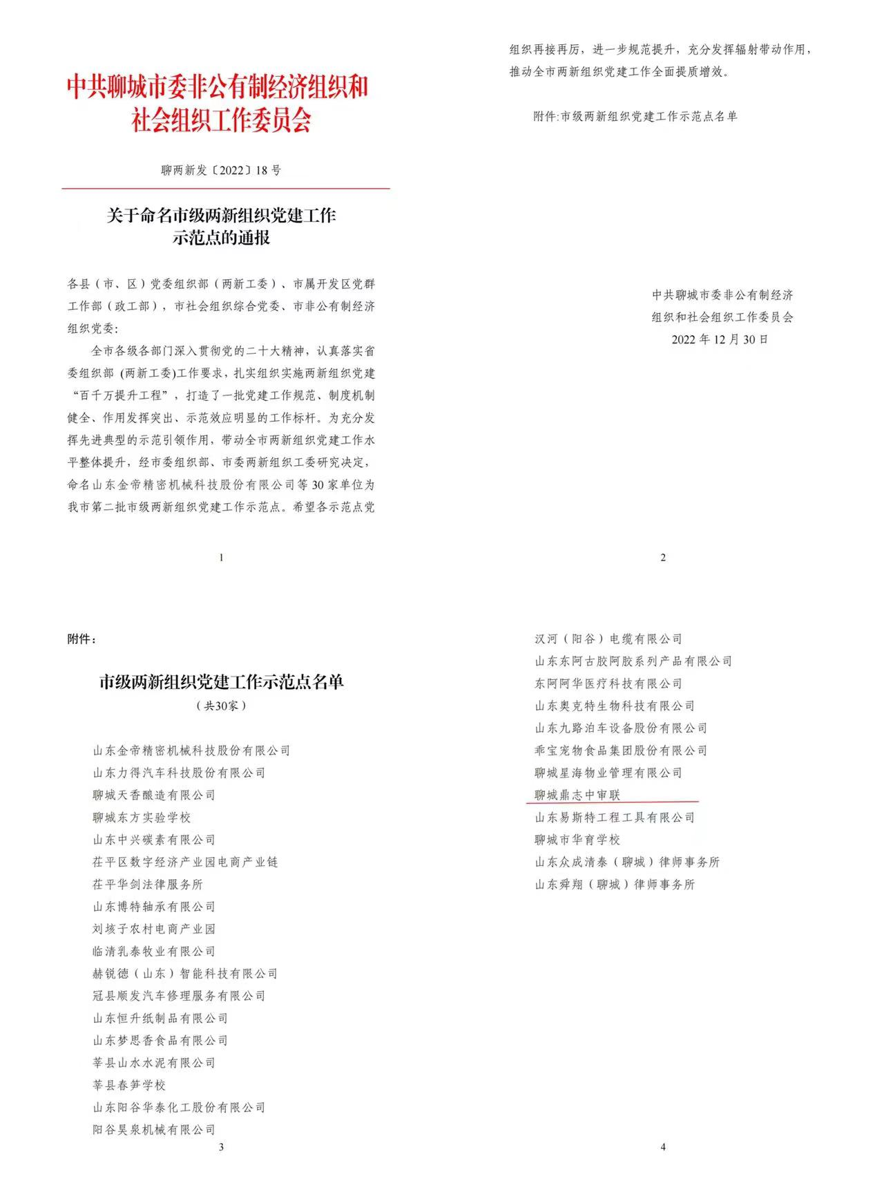 近日,中共聊城市委非公有制经济组织和社会组织工作委员会发布《关于命名市级两新组织党建工作示范点的通报》,聊城鼎志中审联党支部获评“市级两新组织党建工作示范点”荣誉称号。本次命名工作旨在充分发挥党建典型的示范引领作用,落实全省基层党建工作重点任务推进会精神,推进两新组织党建“百万提升工程”工作。
