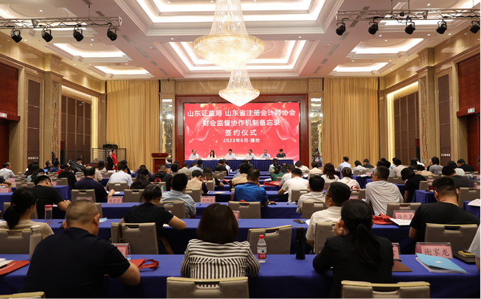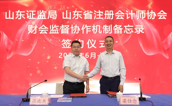 为充分履行财会监督职责,实现行政监管和行业自律监管有机融合,有效发挥注册会计师行业审计鉴证作用,6月13日上午,在山东省注册会计师行业“证券审计业务”专题培训班开班之际,山东注协与山东证监局隆重举行《财会监督协作机制备忘录》签约仪式。山东证监局党委委员、副局长张兆兵,省注协副会长兼秘书长梁仕念,山东证监局公司监管三处处长杨冬芳,潍坊市财政局四级调研员、市行业党委书记王献之,省注协原副秘书长张吉轩等领导出席签约仪式。